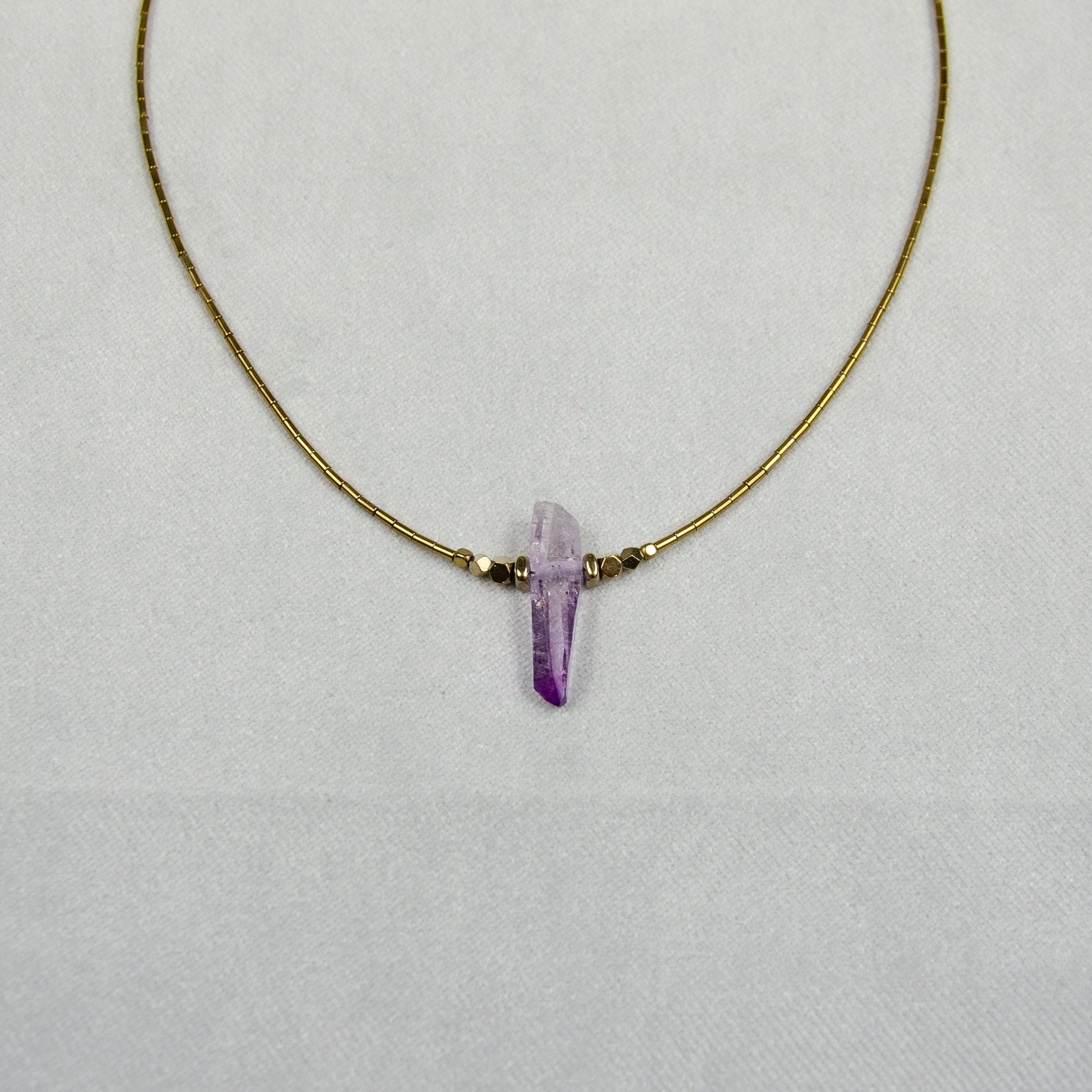 This One necklace features a Vera Cruz Amethyst small laser point centre piece (2cm long) and is strung with tiny electroplated gold hematite tubes a sterling silver clasp and Joodaboo tag.