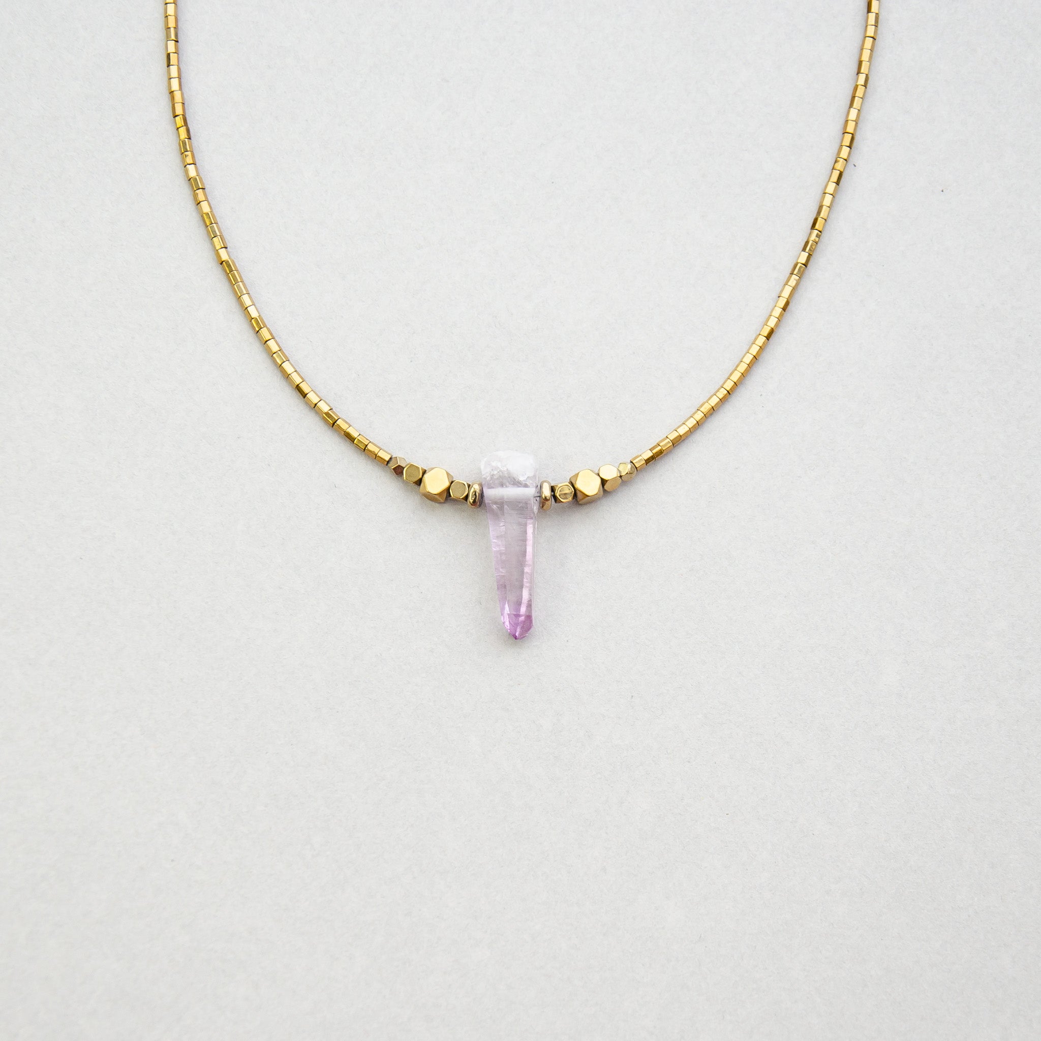 This One necklace features a Vera Cruz Amethyst centre piece (1.5cm long) and is strung with electroplated gold hematite hex beads, a sterling silver clasp and Joodaboo tag.