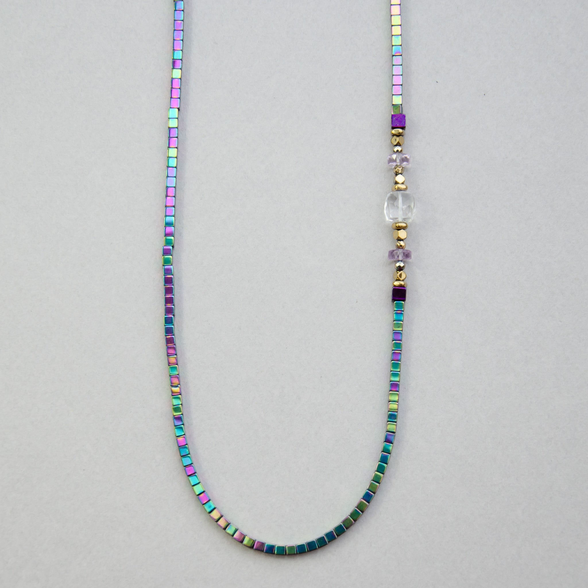The Slink - a delicate strand of dark rainbow metallic electroplated hematite cube beads with a clear quartz faceted cube will bring a sparkle to your day, whether you are at work, on the beach or out to party.