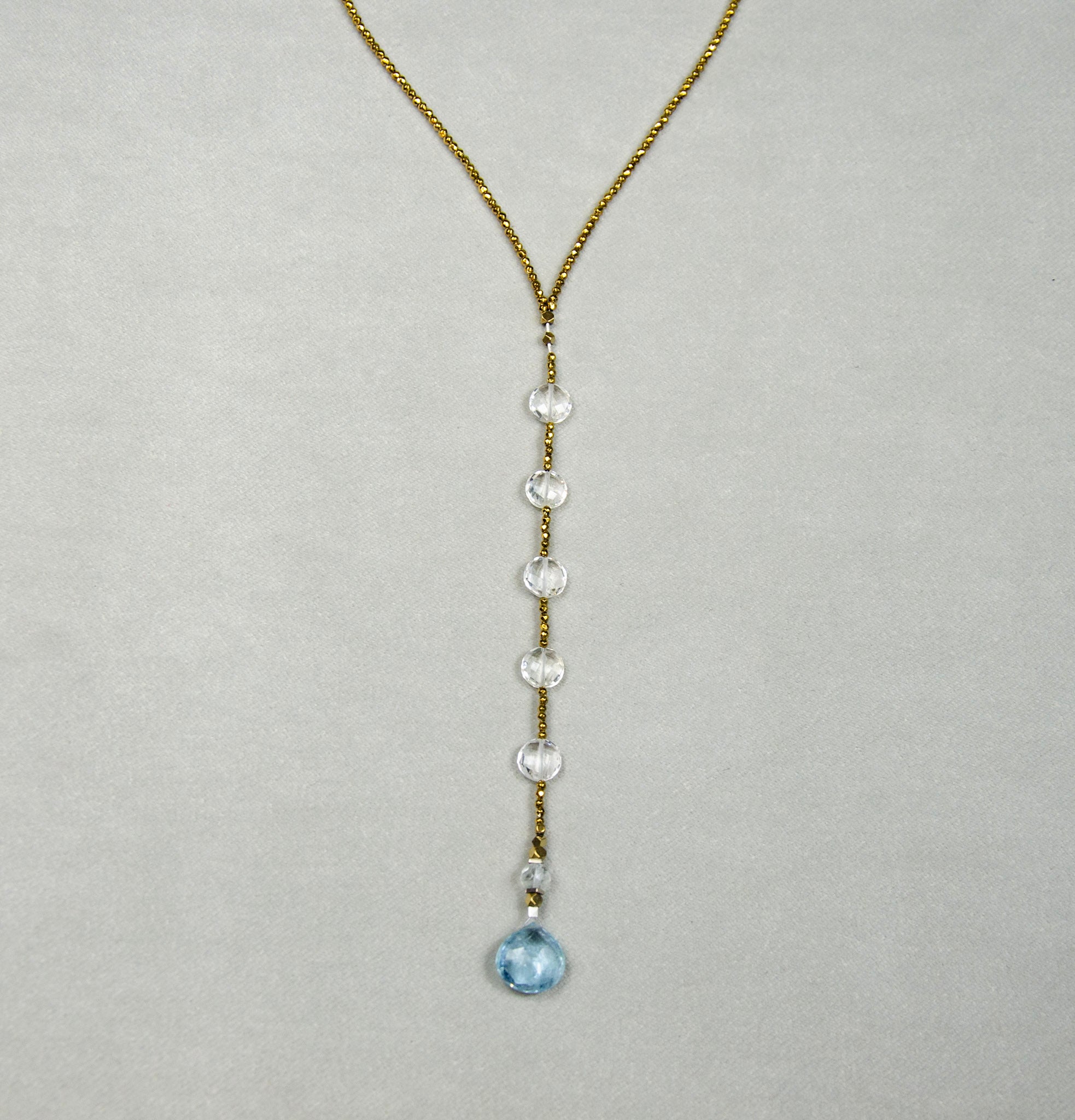 It is made with a single Aquamarine faceted heart drop gem and Aquamarine faceted rondelle, four 8mm clear quartz faceted coins. Strung with tiny electroplated gold hematite round beads and a gold filled clasp and sterling silver Joodaboo tag.