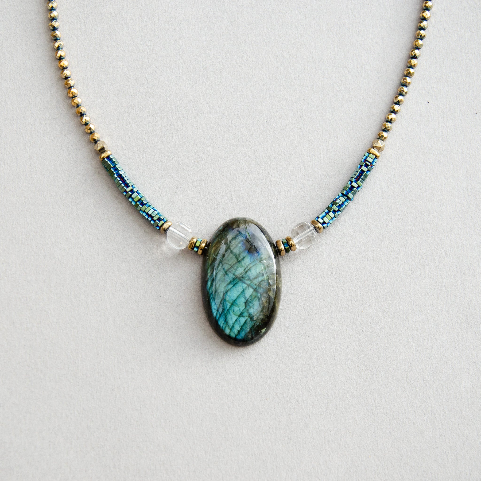 One of my favourite stones. The iridescent multi colours of ladradorite never fail to uplift and inspire a deeper understanding of yourself. Labradorite is one of the crystals that resonates with all chakras, which makes it an excellent balancer for the whole energy system and probably why it feels so good to wear. Known as the 'magic stone' it is excellent for strengthening intuition and developing psychic abilities. Paired with Apatite and Aquamarine for throat chakra resonance to support clear communication and expression, makes it a magical throat chakra talisman.