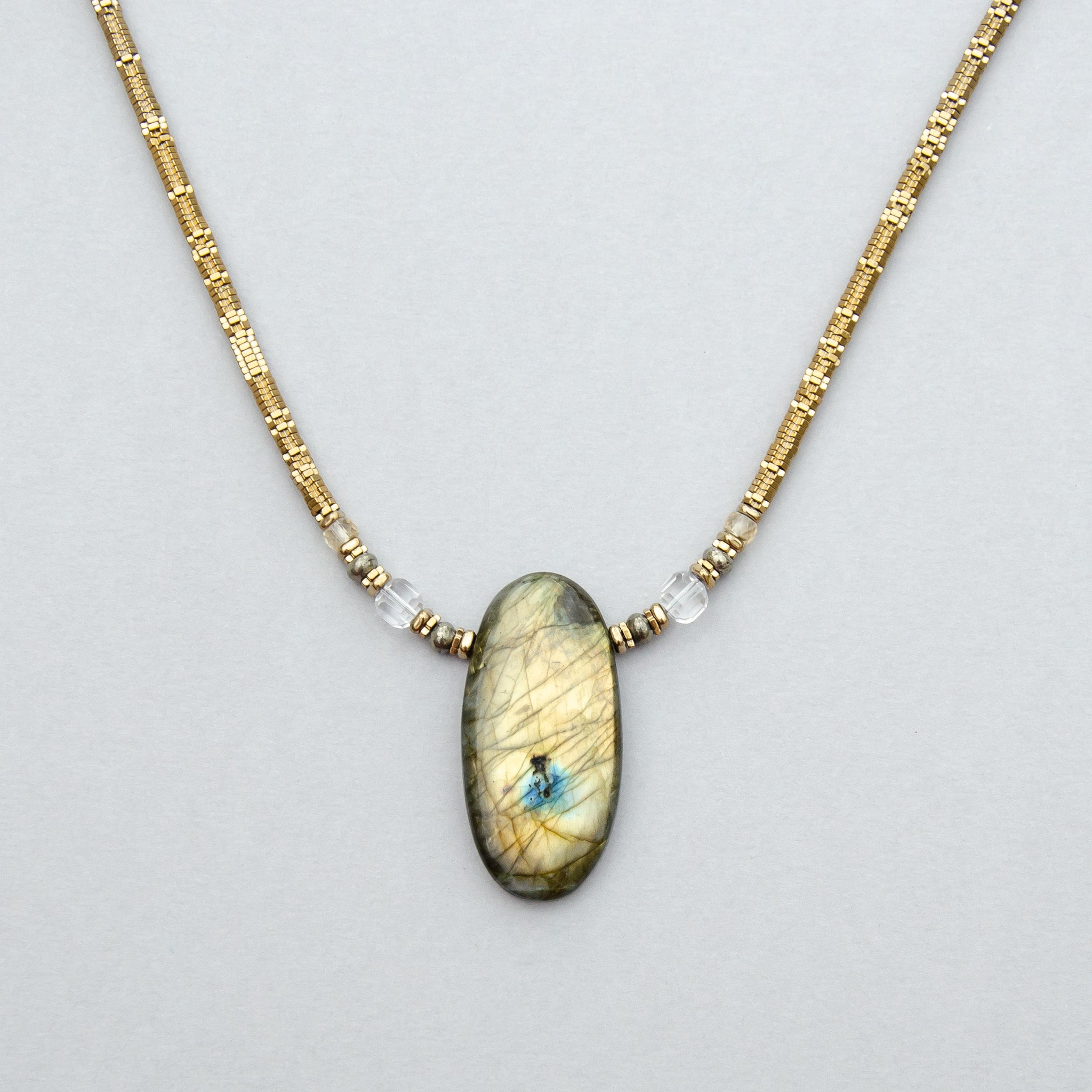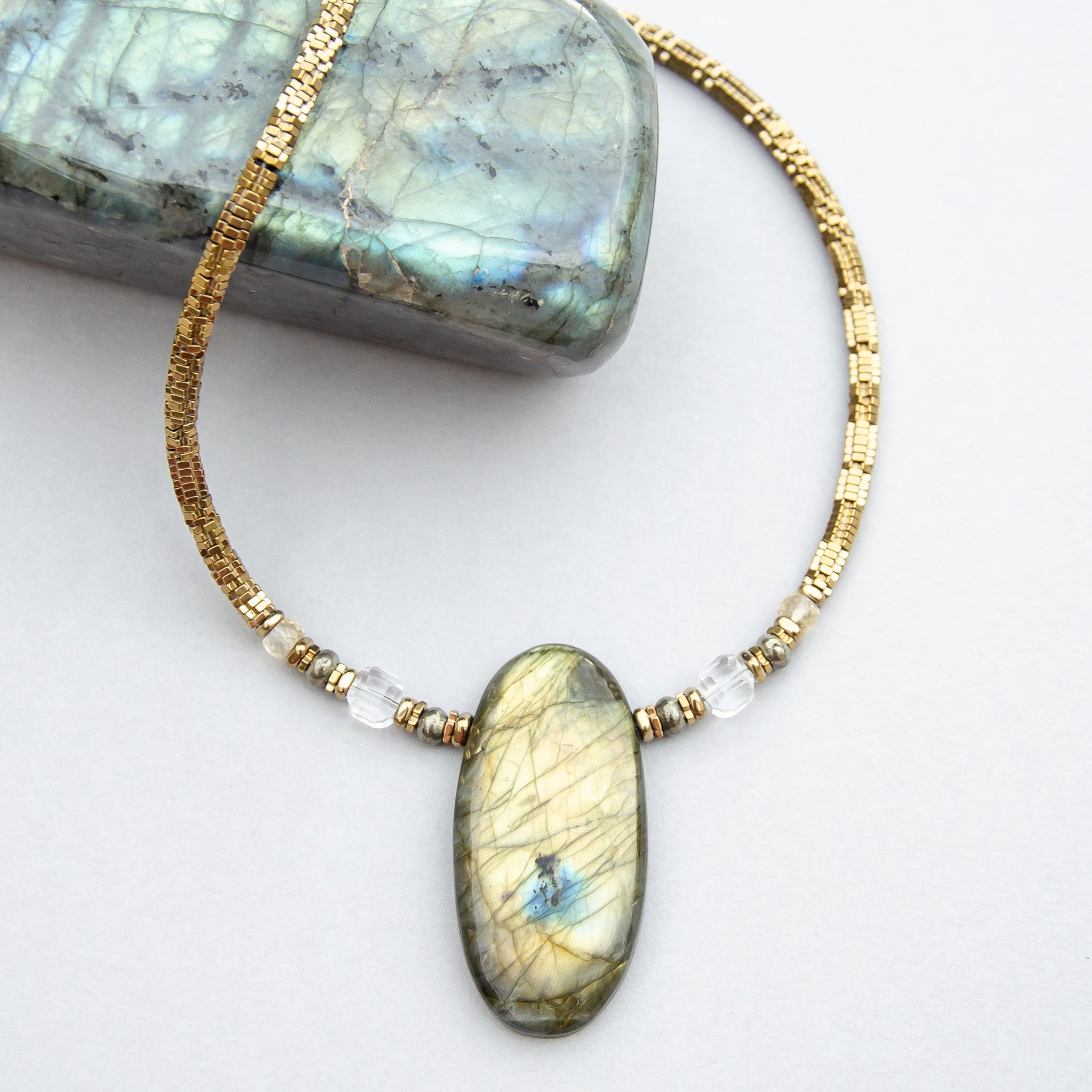 This stunning Five Star talisman features a large golden flash, Labradorite cabochon paired with Clear Quartz faceted cubes, Pyrite and Citrine rondelles, strung with electroplated gold hematite beads, a sterling silver clasp and Joodadoo tag.