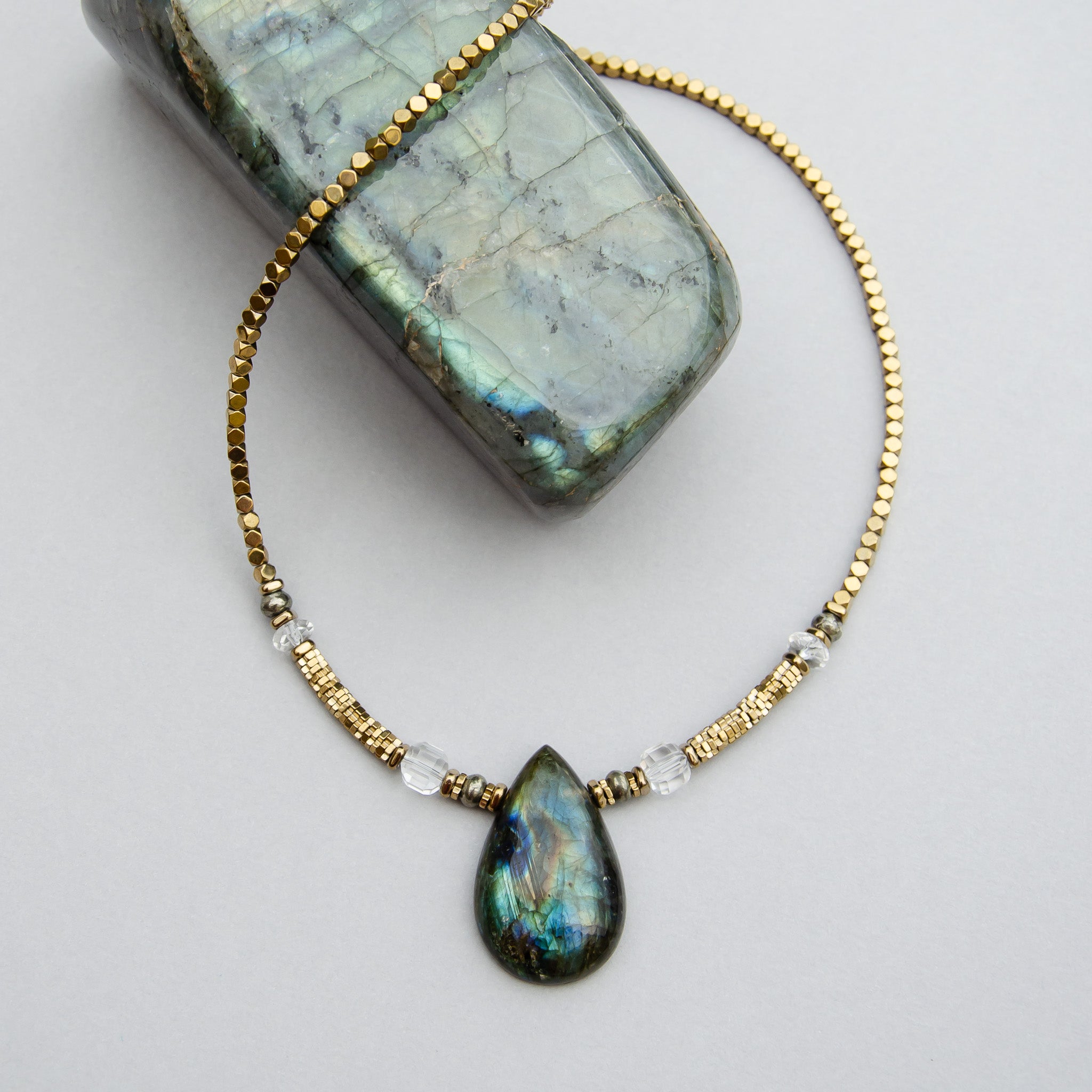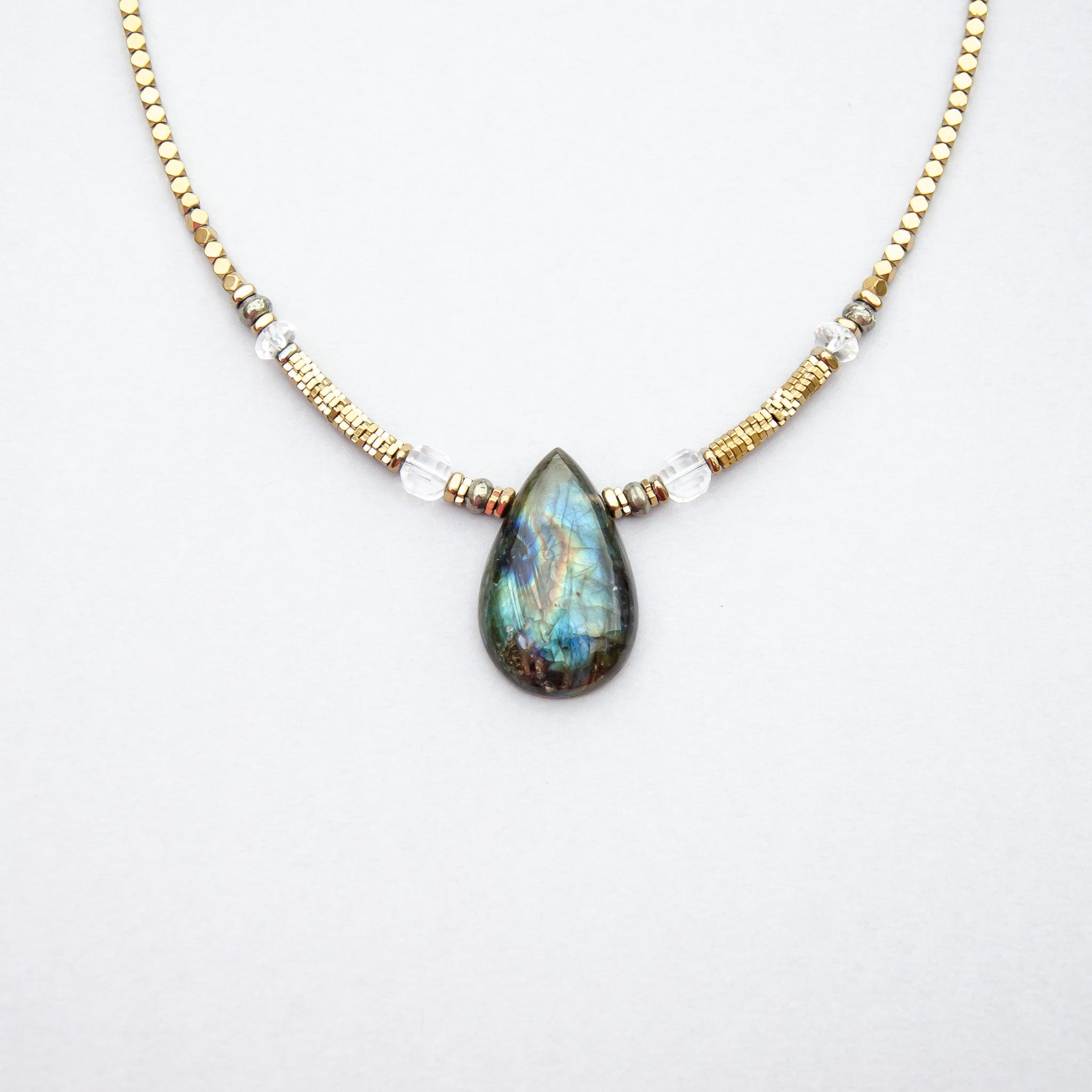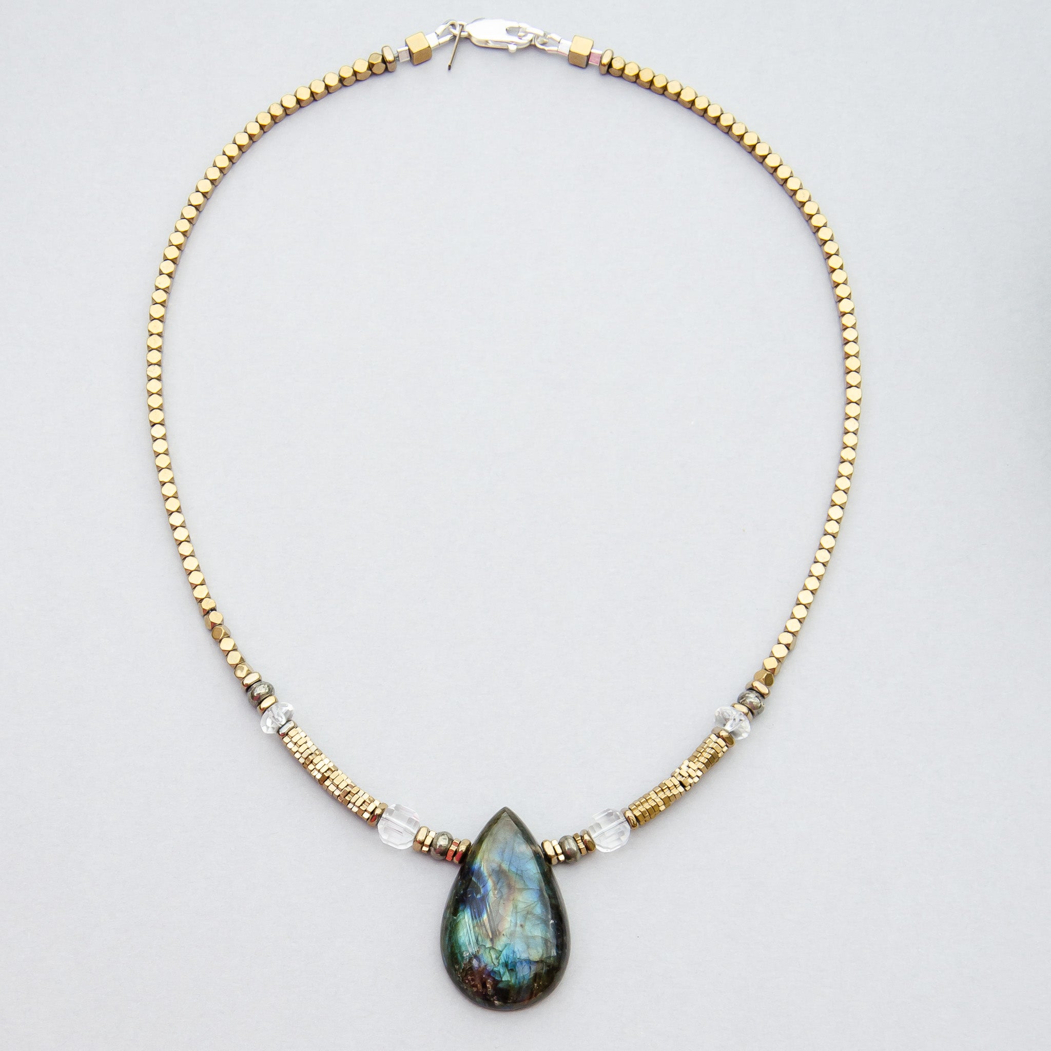This Five Star talisman features a Labradorite smooth teardrop cabochon paired with Clear Quartz faceted cubes and pyrite and clear quartz rondelles, strung with electroplated gold hematite beads, a sterling silver clasp and Joodadoo tag.