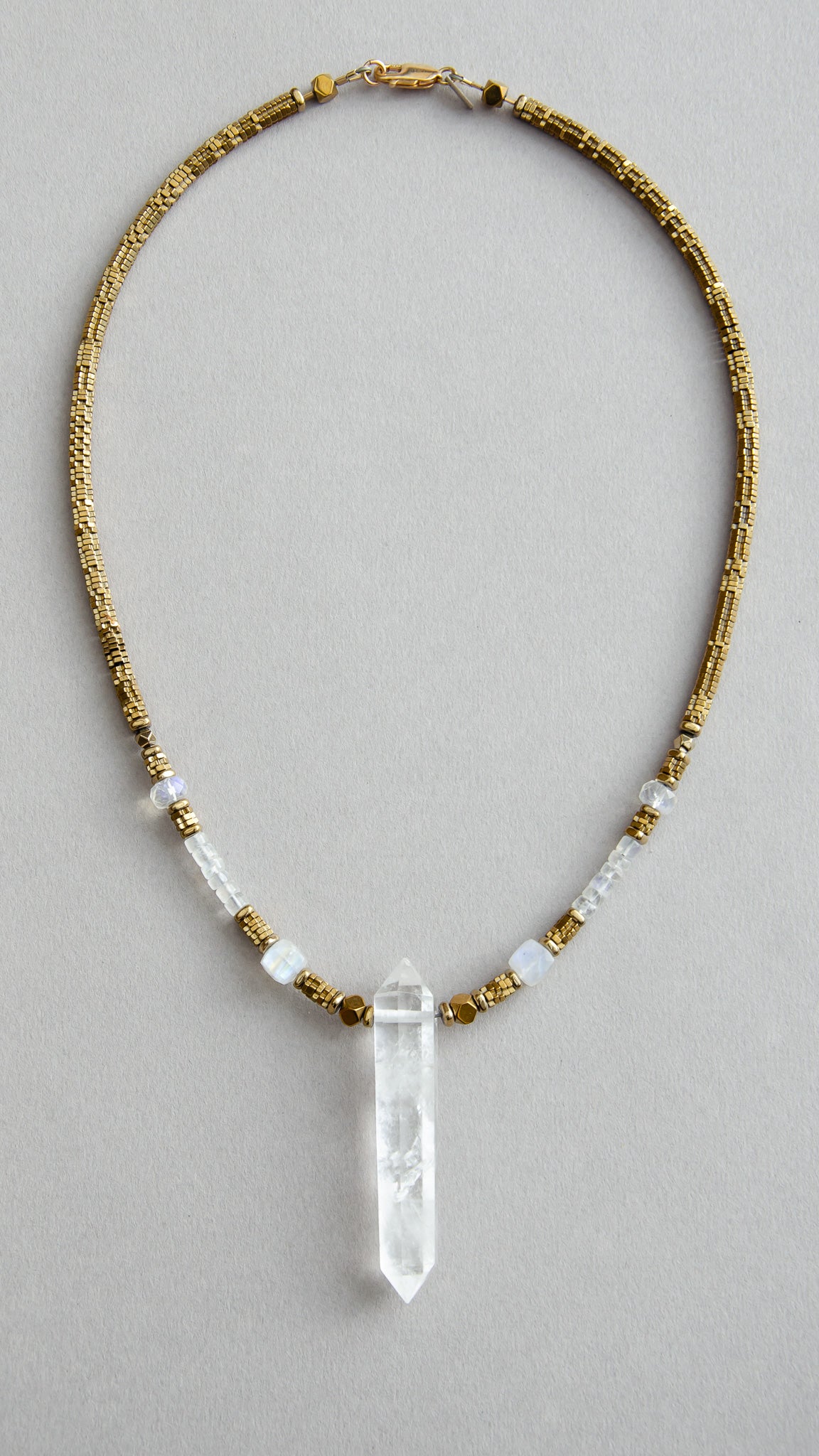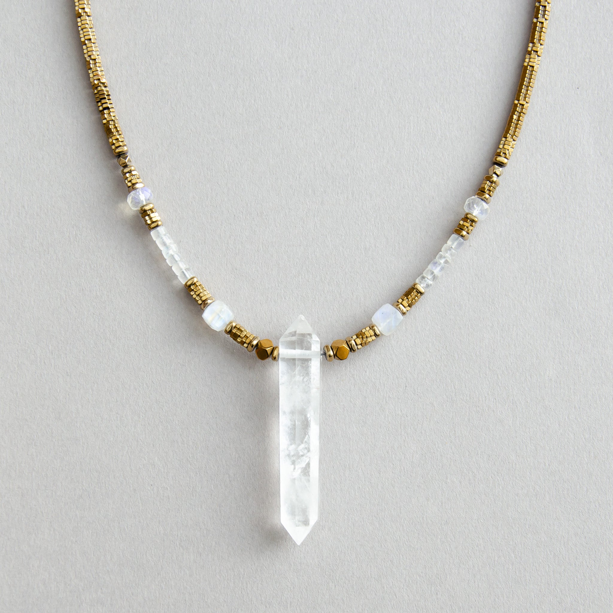 This strong and feminine talisman features a double terminated Clear Quartz centre piece, paired with Rainbow Moonstone gems. Strung with electroplated gold hematite cross beads, a gold filled clasp and a Sterling Silver Joodaboo tag.