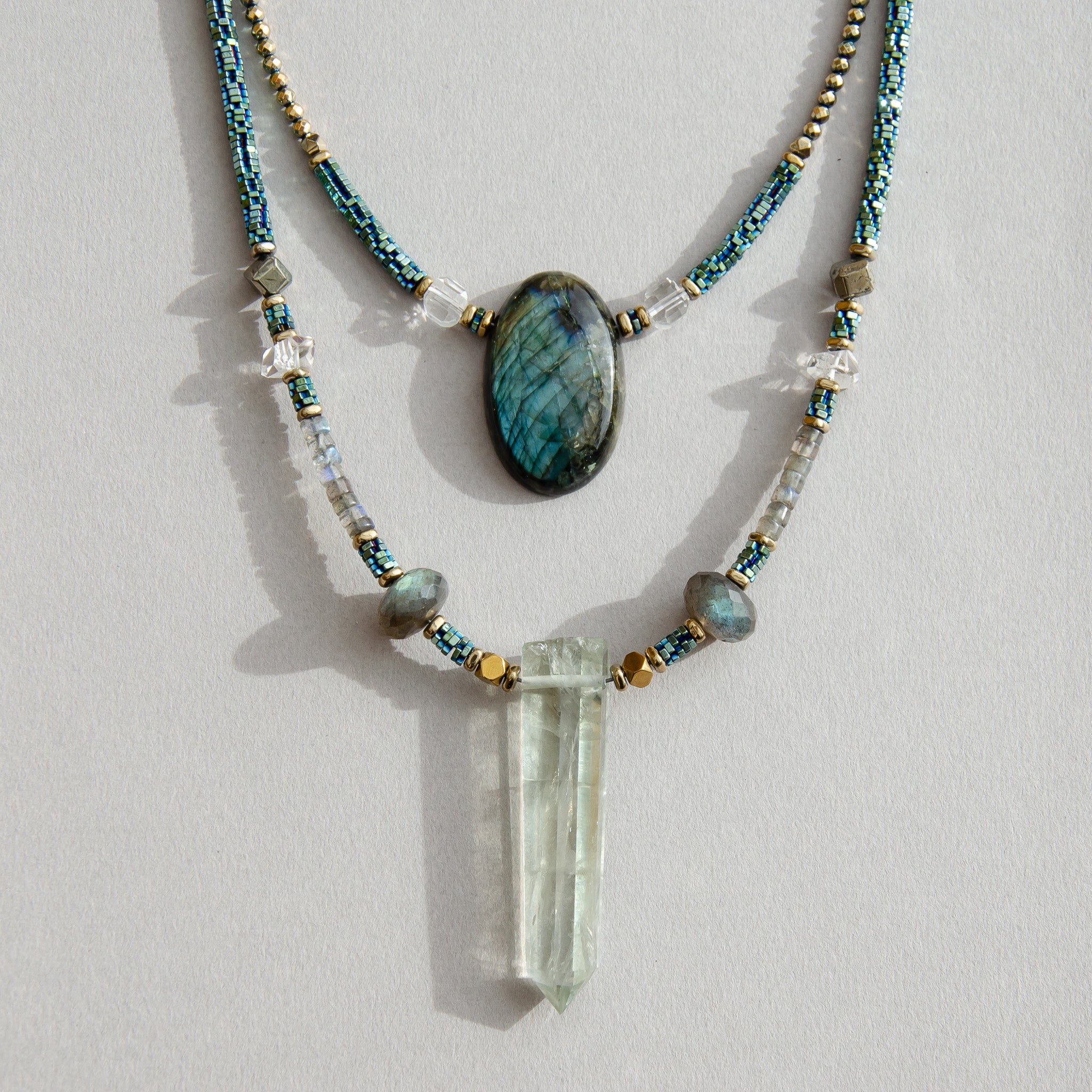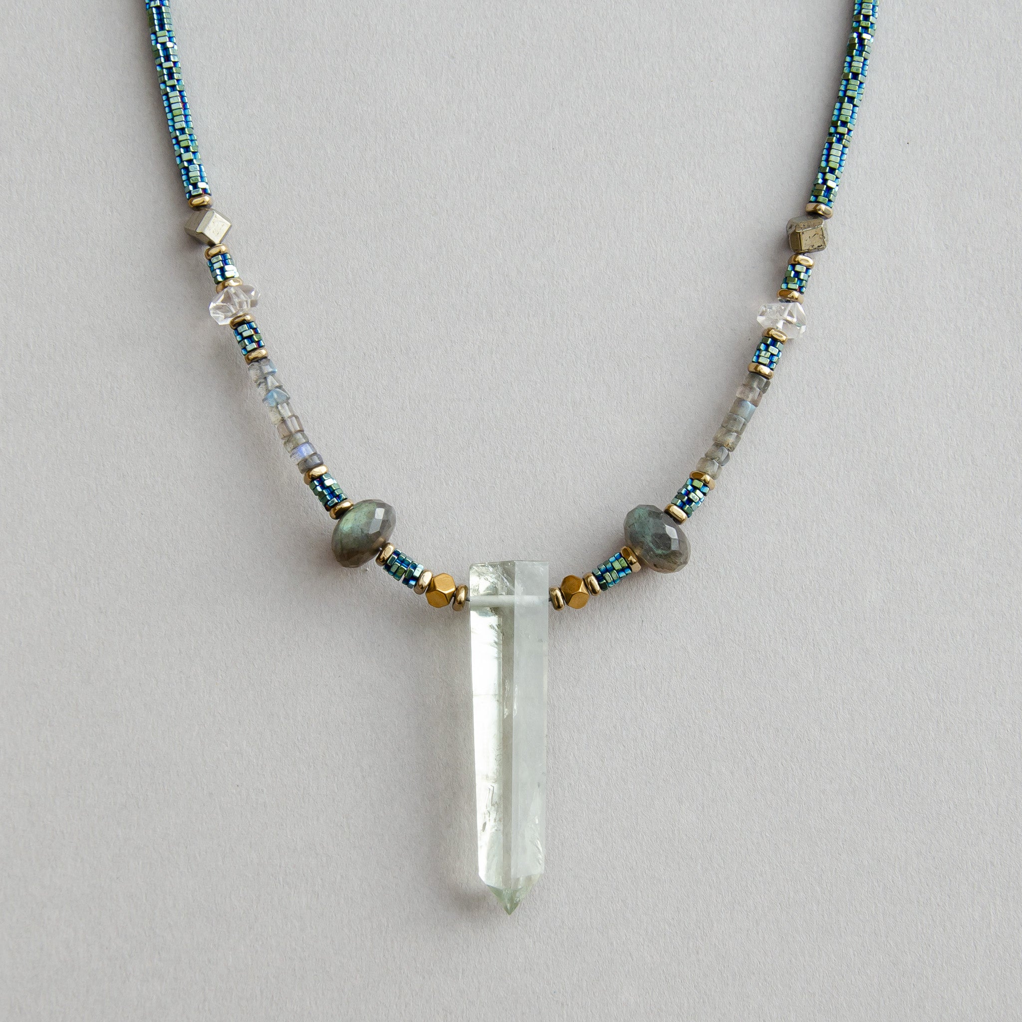 This Heart Star, connects to the heart frequencies through the green color ray - it features a Prasiolite (Green Amethyst) centre piece, with luscious green/turquoise flash Labradorite faceted rondelles, and smooth tyre beads. It is strung with Pakimer Diamonds - that amplify the frequency of the crystals they are next to, Pyrite cubes for grounding and solar plexus resonance and electroplated teal, hematite cross beads. It has a gold filled clasp and a sterling silver Joodaboo tag.