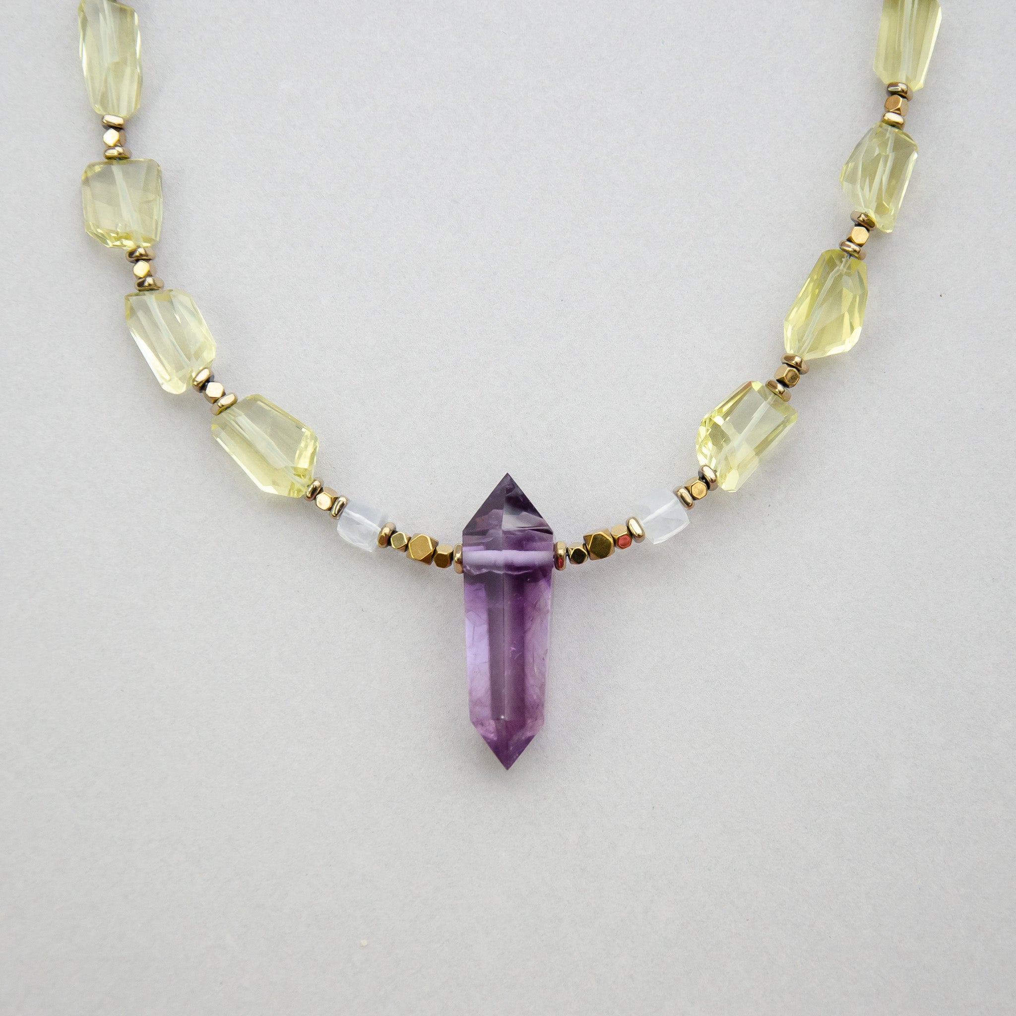 This stunning Five Star features an Amethyst double terminated crystal centre piece, Ice Quartz faceted cubes either side and strung with brilliant Lemon Quartz faceted nuggets a sterling silver clasp and Joodaboo tag.