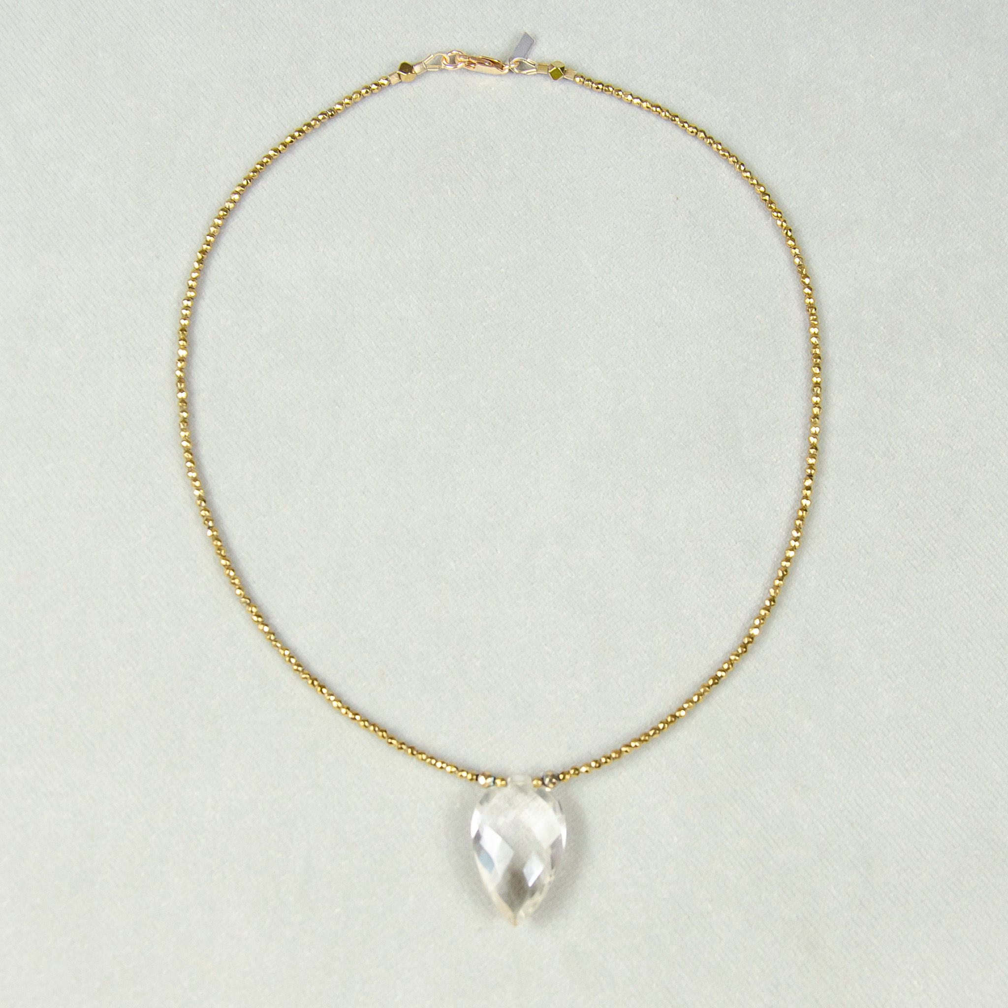 This Joodaboo ONE necklace features an exquisite single large clear quartz faceted teardrop gem. It is strung with electroplated gold hematite tube beads, a gold filled clasp and sterling silver Joodaboo tag.