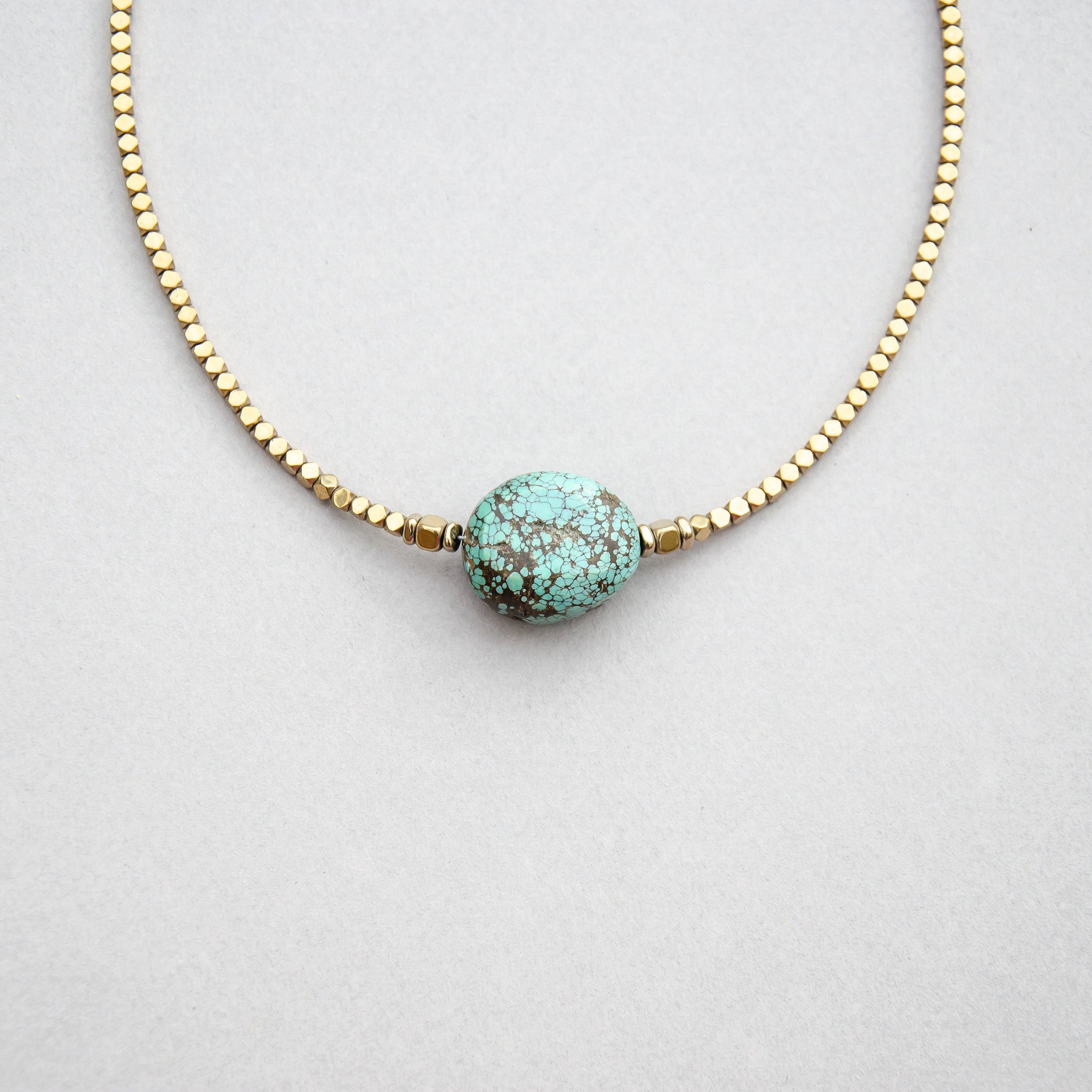 This Joodaboo ONE necklace features a smooth turquoise bead, strung with electroplated gold hematite faceted cube beads, a sterling silver clasp and Joodaboo tag.