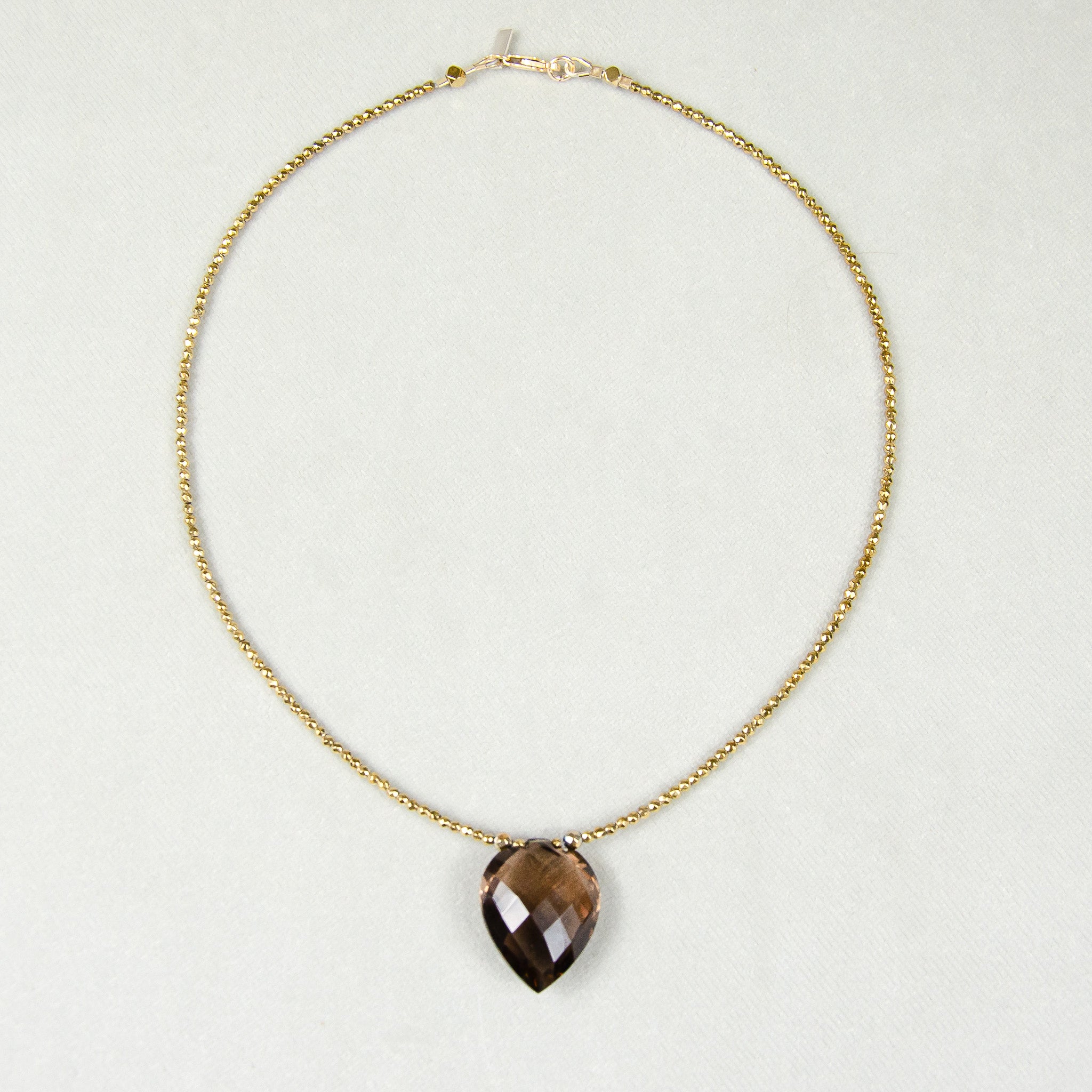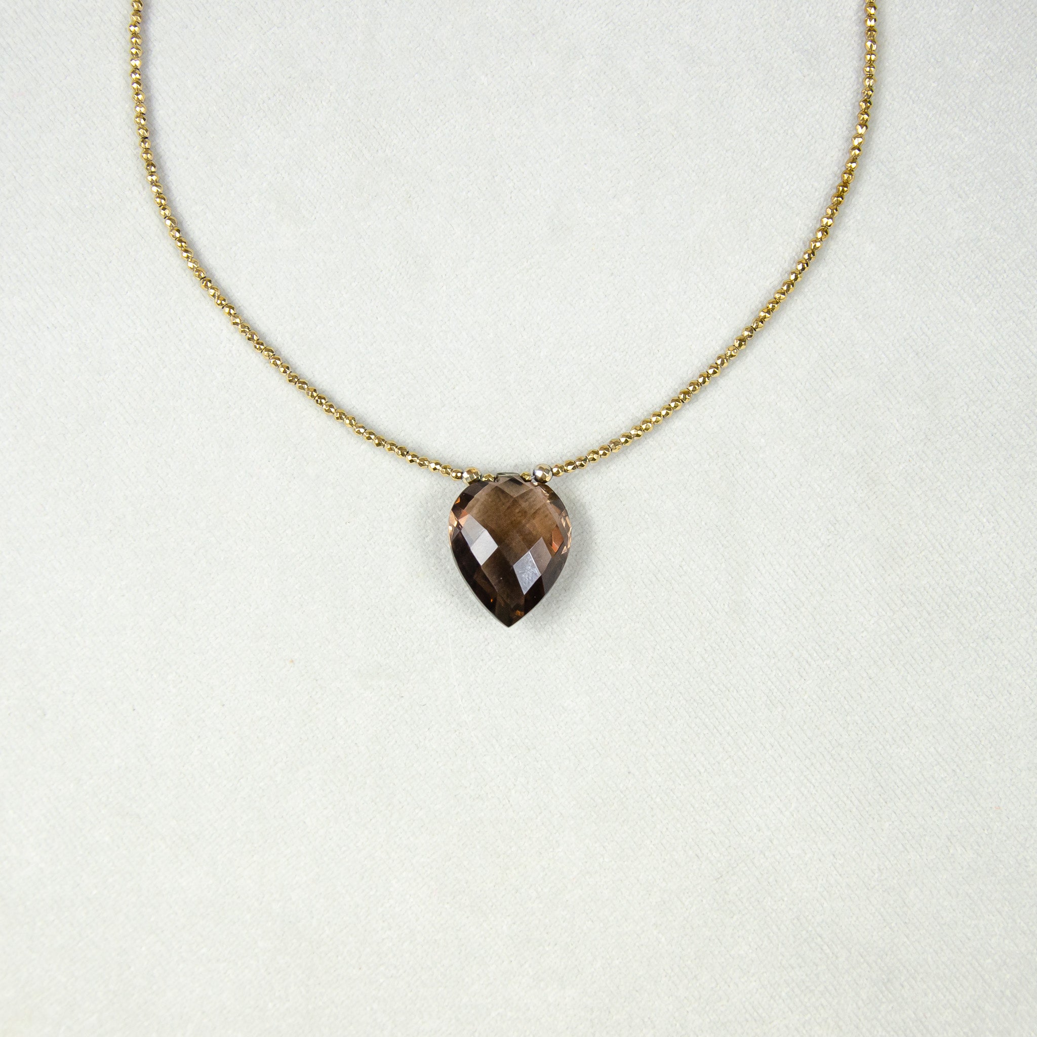 This Joodaboo ONE necklace features an exquisite single large smokey quartz faceted teardrop gem. It is strung with electroplated gold hematite tube beads, a gold filled clasp and a sterling silver Joodaboo tag.