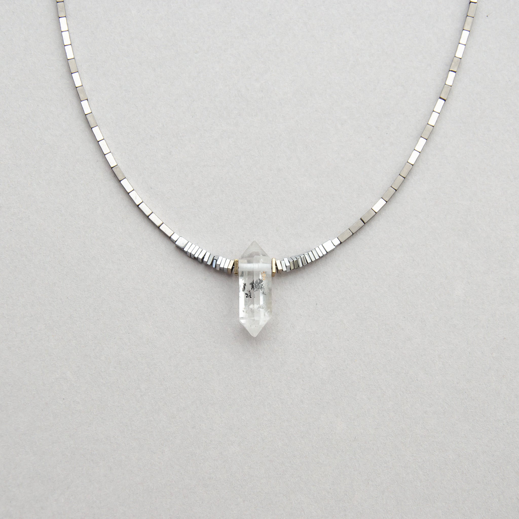 Mens One necklace featuring a Clear Quartz double terminated crystal centre piece with black tourmaline inclusion. Strung with electroplated silver Hematite beads, sterling silver clasp and Joodaboo tag.