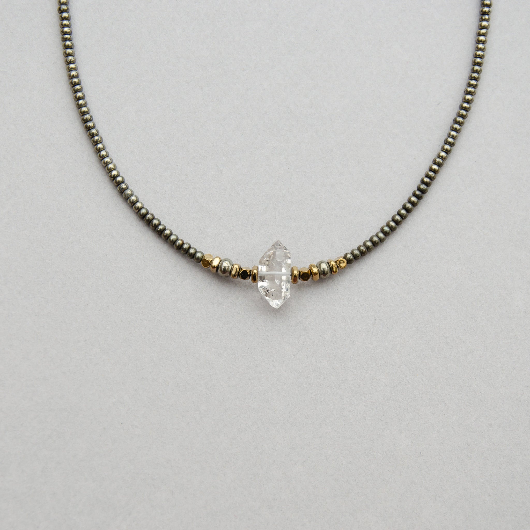 Mens One necklace featuring a high frequency Pakimer Diamond, double terminated Clear Quartz centre and strung with Pyrite and electroplated gold hematite detail. Sterling silver clasp and Joodaboo tag.