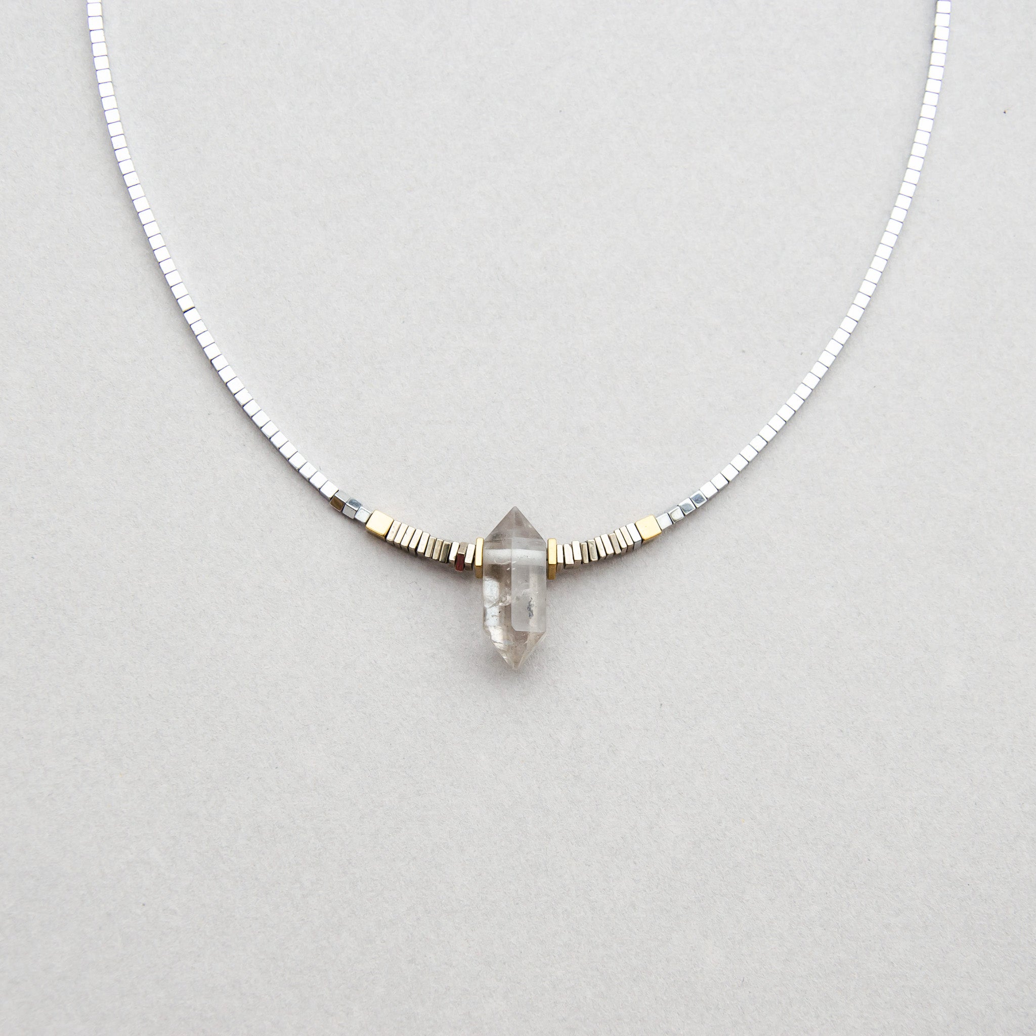 Mens One necklace featuring a pale smokey quartz double terminated crystal centre piece with black tourmaline inclusion. Strung with electroplated Hematite, sterling silver clasp and Joodaboo tag.
