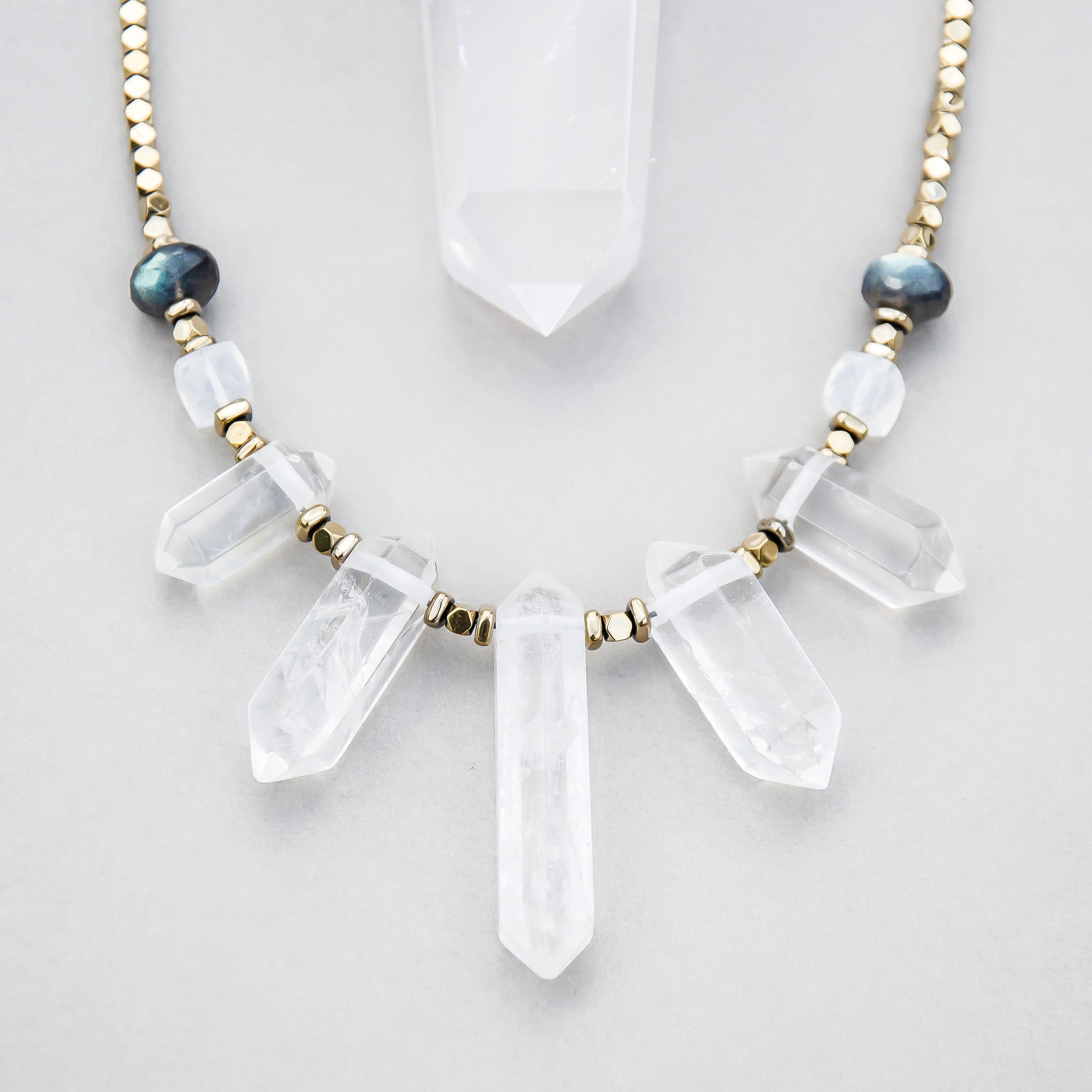 This stunning Warrior necklace made with Clear Quartz, is designed to enhance your expression by amplifying the energy from your throat chakra. It is blended with the frequencies of ice quartz and Labradorite.