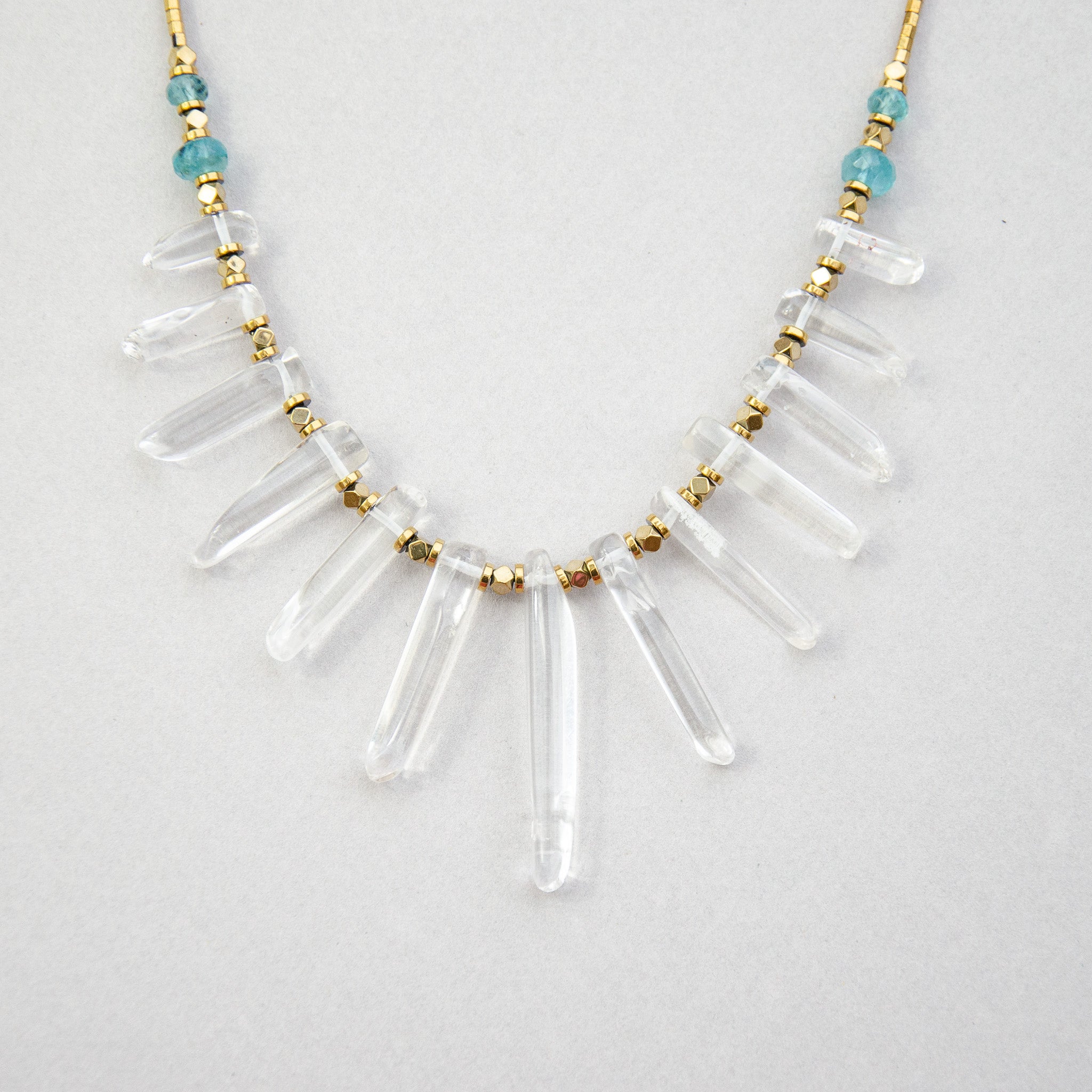 It is made with a fan of smooth clear quartz points, 5cm long in the centre radiating out to 2cm. It is strung with Apatite faceted rondelles, Aquamarines and electroplated gold & blue faceted hematite rounds. It has a sterling silver clasp and Joodaboo tag.